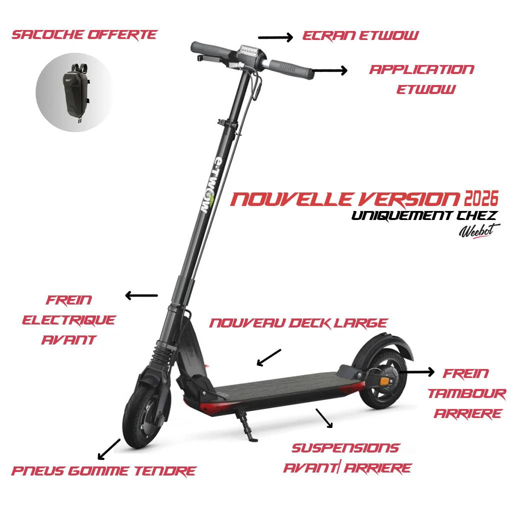 Évolution finale de la gamme ETWOW, la Etwow GTS Version 2026 est un monstre de puissance de 700W couplé d’une batterie de 48V 10,5Ah. Weebot vous propose en exclusivité cette batterie plus puissante C’est une trottinette électrique qui décoiffe ! Pour accompagner une telle fougue, l’appareil doit disposer d’un bon système de freinage. Ainsi, le fabricant l’a doté d’un frein électrique avant avec système KERS de régénération de batterie, mais aussi d’un frein tambour arrière pour des freinages sûrs et réactifs.